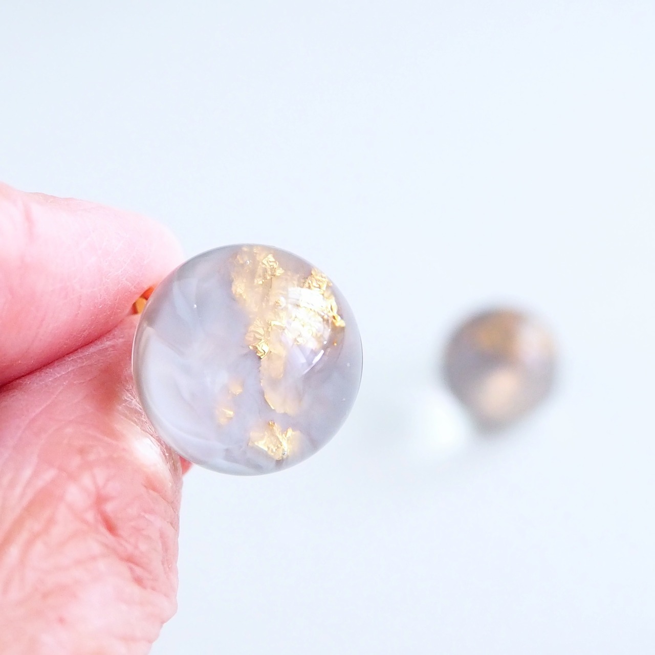 透明感とゴールドの繊細な輝きが曇らないように、レジンの流し込みやフレークの配置は一粒ずつ丁寧に調整。