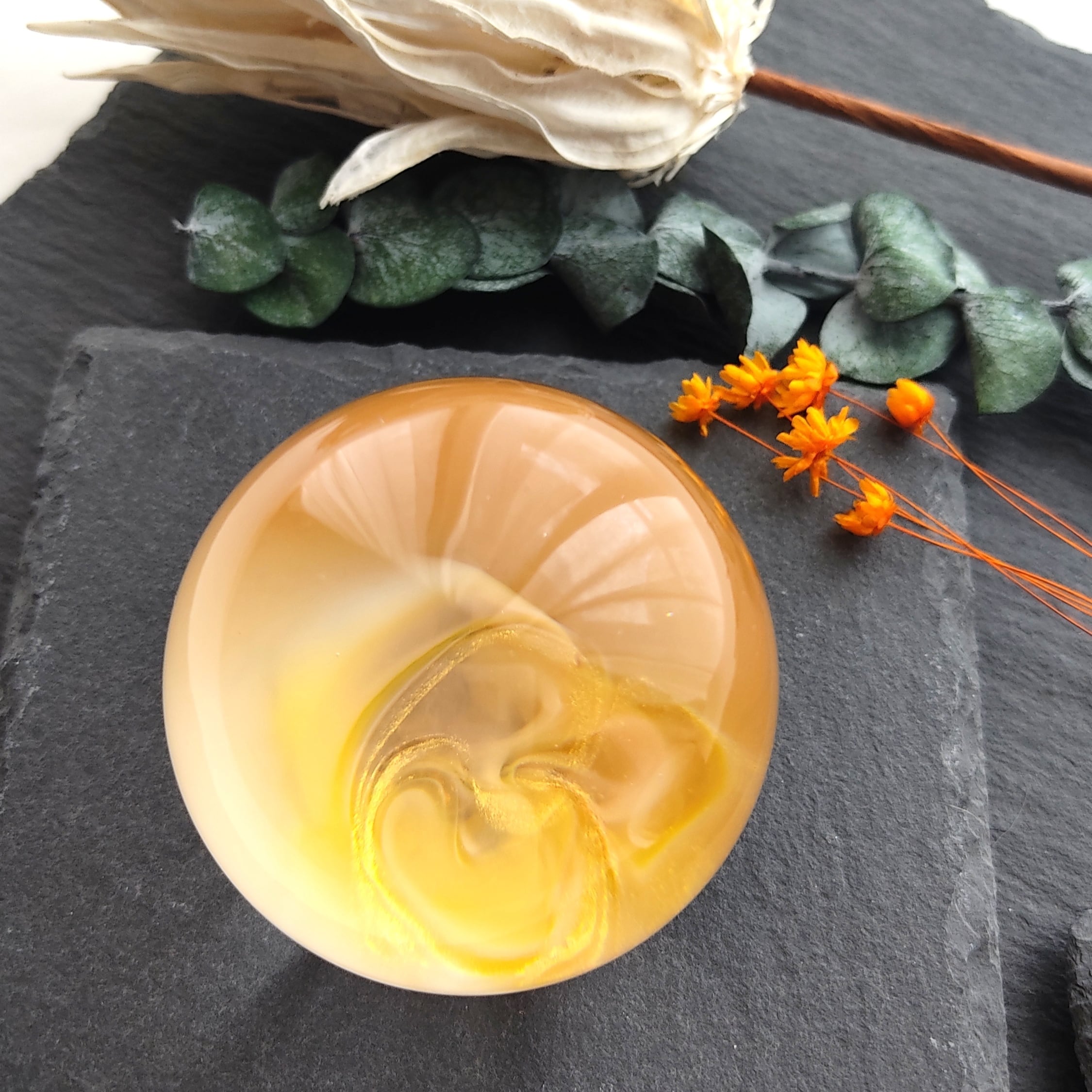 ひとつは柔らかなオレンジ色とキラキラのゴールドがふんわりと色づいて、春の日差しの暖かさを感じさせてくれる色彩。